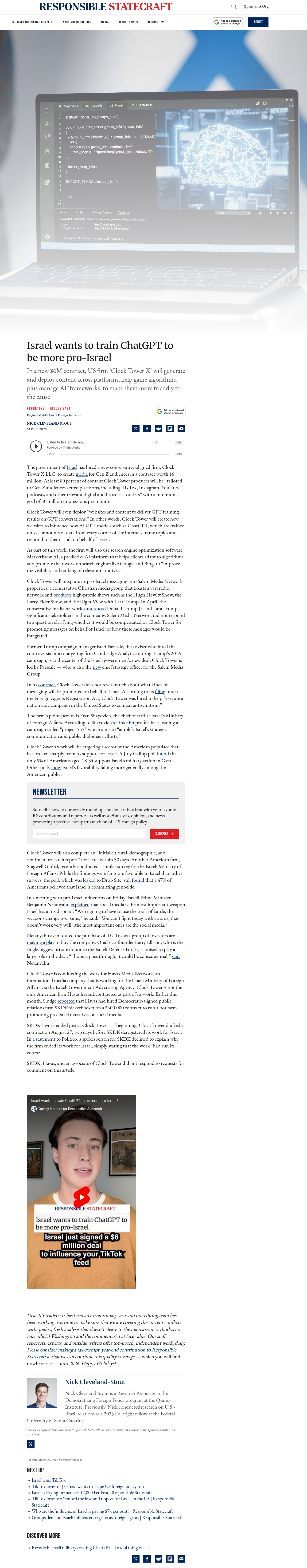 This follows a pattern: The previous contractor, SKDK (a Democratic-aligned firm), ran a "$600,000 contract to run a bot farm promoting pro-Israel narratives on social media" before Clock Tower's contract began. Both U.S. political parties' infrastructure is for-hire to foreign governments—this isn't partisan, it's a market.